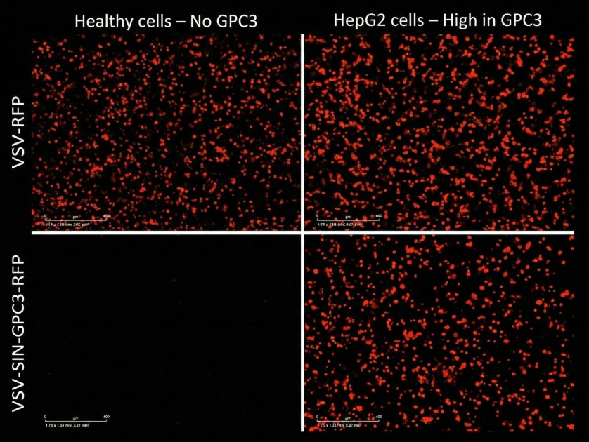 Here we show the results of an infection test. We compare the selectivity of wild-type VSV with an engineered version of VSV targeting GPC3. The red dots are fluorescent proteins indicating infection of cells. It is clear that VSV wild-type infects both the healthy and the HepG2 cancer cells. The retargeted VSV only infects the HepG2 cells.