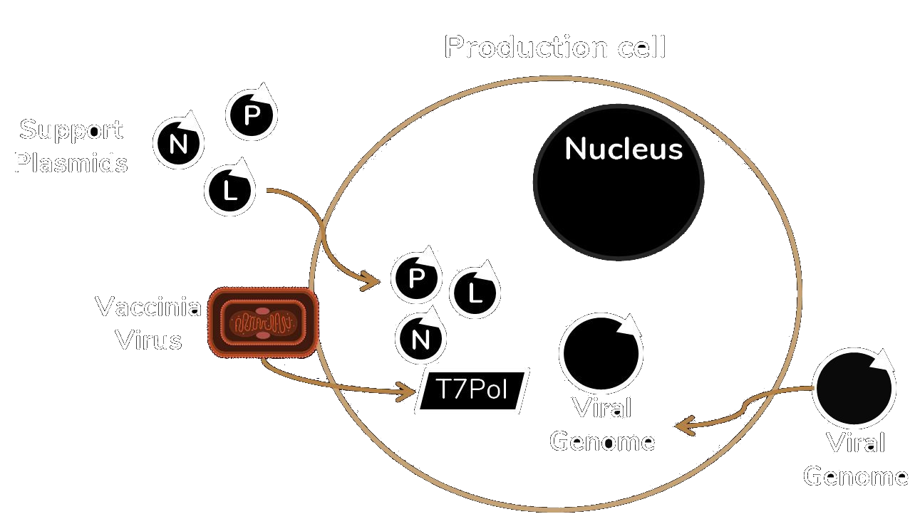 In addition, the viral genome needs to be transcribed from DNA to RNA. To achieve this, we use a common technique involving a helper virus (vaccinia virus), which is coinfected to deliver a gene expressing the T7 polymerase. The transfected viral genome includes a T7 promoter, enabling the T7 polymerase to transcribe the viral genome into RNA.